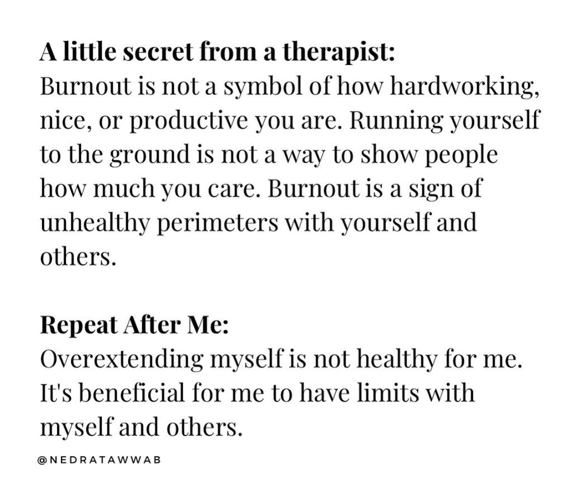Because burnout isn’t just about working too much. I love the way Nedra Tawwab describes it below—she really articulates the way burnout relates to not treating ourselves kindly. And something I find myself writing about, repetitively, is how similar controlling our body through controlling our food is to the dynamics of an unhealthy (or toxic) relationship.