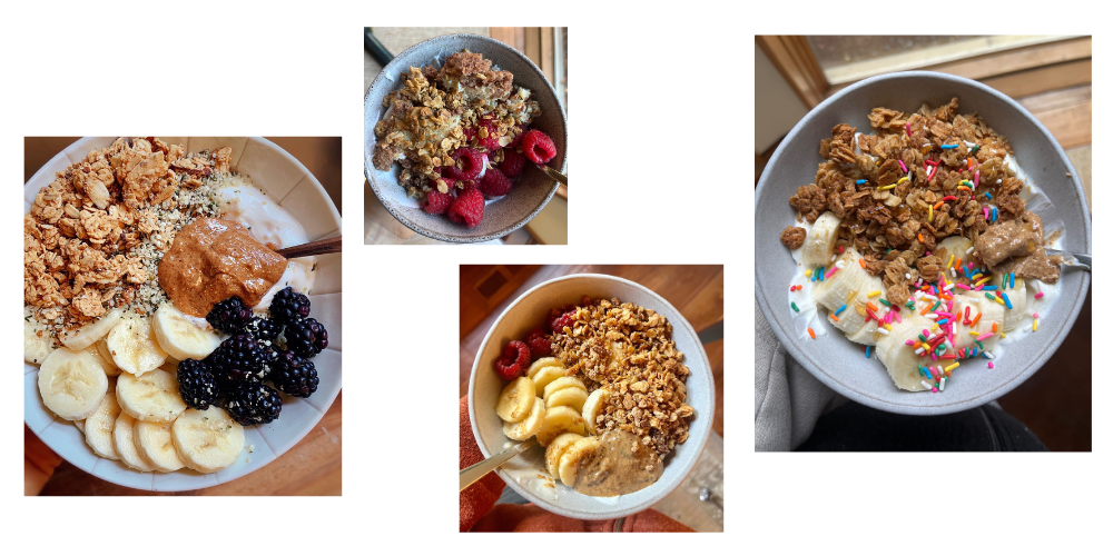 They typically start with a base of vanilla yogurt, followed by a sliced banana, plenty of granola, swirls of peanut butter, and either honey or jam. Maybe berries and nuts if I think of it. Nine times out of ten, there is also a baked good in there (like a blueberry muffin, banana bread, coffee cake, etc.).
