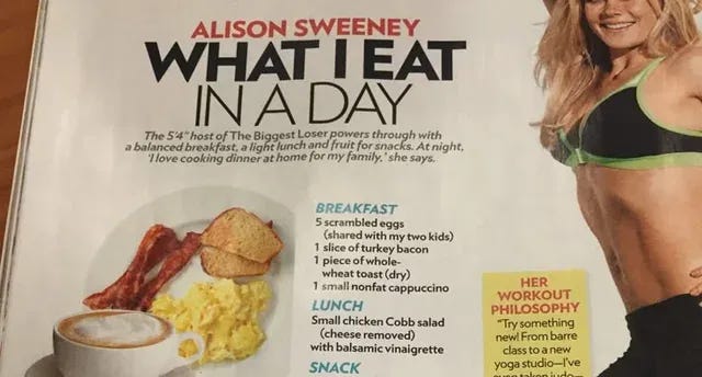 Think about it: magazines in the 90s and 2000s glorifying a “day of eating” within some absurdly low number of calories. Diets and “lifestyles” that insist on obsessing over nutrition labels and ingredient lists. Perfectionistic thinking about food choices and portion sizes. Social media graphics showing two side-by-side meals—the “original” calorie amount versus the “lower-calorie” version. Weight loss medications that frame hunger as a problem. The normalization of meticulously measuring and weighing food to hit your macros. And now, restaurants plaster calories on menus while influencers flood our feeds with “what I eat in a day” posts. It’s everywhere, and it’s relentless.
